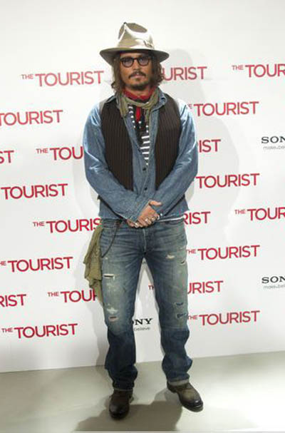 一身“破爛”的牛仔裝,還是很適合約翰尼-德普的。精心挑選的圍巾和手帕和這頂復古男式禮帽顏色呼應,小西裝馬甲也被從柜子中翻了出來套在身上。