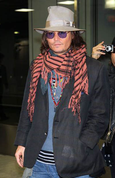 帽子還是一頂復古男式禮帽,粗麻質的三角圍巾和紫色墨鏡,也許你想都沒想到過這樣的組合。但是到了約翰尼-德普身上確實那么搭調,是不是還有些許杰克船長的影子。