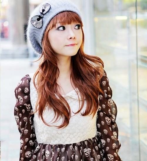 毛線毛質帽子+微卷齊劉海長發,既保暖,又打造時尚造型,突顯超級甜美耀眼形象,淡雅的帽子搭配水晶蝴蝶結,在清純中加入一些活潑與可愛。