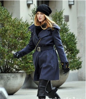 藍色的大衣收身有范兒配上黑色的皮褲與平底鞋都很有范兒。黑色的毛線帽不僅保暖更增添時尚感。