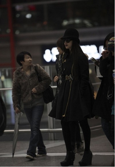 范冰冰黑色卷檐帽搭配黑色傘形大衣,再加上黑眼鏡黑褲黑靴子,一身黑到底,成功顯瘦的同時更凸顯女王范兒。 www.gddjwl.com 帽子廠家