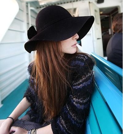 卡其色的毛呢大檐帽,可愛的系帶式蝴蝶結點綴,讓素雅的毛呢帽子,多了幾分甜美的感覺呢。
