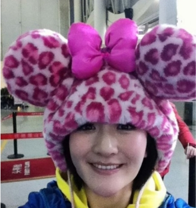 謝娜這款毛絨卡通帽子,紫紅色更有甜美可愛的感覺,很小女生哦。