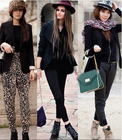 2011年的T臺上開始大肆流行動物的圖案,豹紋作為經久不衰的元素,被無數人傳唱出美麗的傳說,這位街拍達人可以說是十足的豹紋控!簡約的黑色西裝如果沒有豹紋哈倫褲的襯托,一定是沉悶且毫無生氣的,不甘寂寞的豹紋元素又出現在帽子上,簡潔緊實的設計,令模特的頭部造型看起來十分的精致大方,模特在兩個單品上同時選擇豹紋,卻沒有感到一絲的凌亂和眩暈,利用黑色將其分層,更感覺層次之間的遞進落落有致。