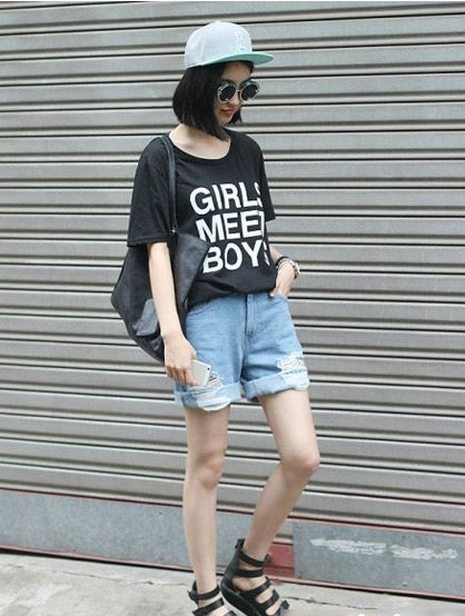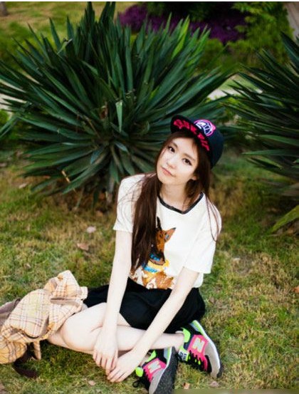 白色動物T恤搭配玄色運動短褲干凈舒服,非常合適美眉青春的臉龐,加上字母春秋5片帽和運動球鞋增加帥氣的感覺,青春的活力無法阻擋。