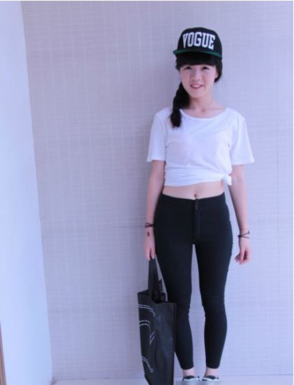 白色T恤的綁腰設(shè)計小路蠻腰,美眉甜蜜的臉龐加上一頂帥氣的春秋5片帽非常加分噢!