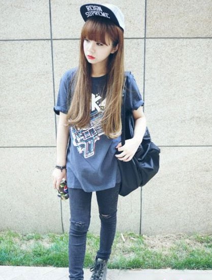 boyfriend風(fēng)的T恤搭配鉛筆褲平凡簡單,加上一定春秋5片帽呼應(yīng)了T恤的涂鴉圖案,布滿街頭氣味,這樣街頭范的妝容穿在甜蜜可愛的金發(fā)小妞身上別有一番風(fēng)味。
