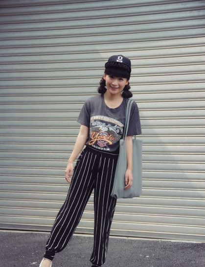 美國風(fēng)圖案T恤搭配條紋運動褲和春秋5片帽成功打造潮爆的街頭運動風(fēng)妝容,可愛的發(fā)型展露美眉甜蜜氣味,但是街頭運動風(fēng)的妝容搭配平底鞋可是有一點突兀噢!