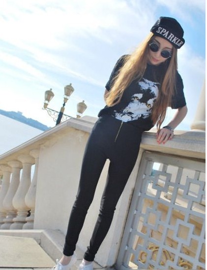 美眉一身玄色動物T恤搭配玄色鉛筆褲妝容神秘帥氣,褲頭束腰展現(xiàn)超長美腿,一頂少女時代風(fēng)的春秋5片帽讓妝容更加靚麗,復(fù)古圓框的太陽眼鏡讓妝容更加時髦。
