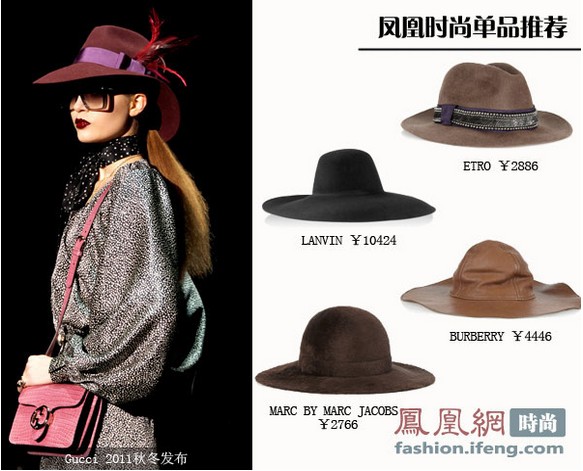寬檐帽無不詮釋著女性的高雅華麗,這個冬季軟呢的款式受到眾人喜愛,細膩的質地華麗的顏色,透露出高貴的氣質。如果你覺得還不夠耀眼,那就選擇一款在帽子上添加羽毛帽子吧,高貴別致的樣子誰不喜愛呢。