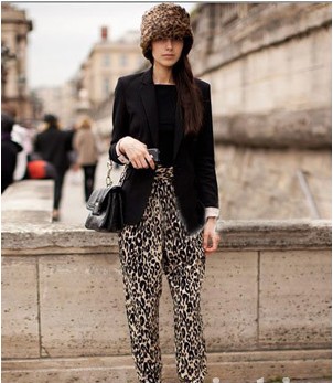 2010 年的T臺(tái)上開(kāi)始大肆流行動(dòng)物的圖案,豹紋作為經(jīng)久不衰的元素,被無(wú)數(shù)人傳唱出美麗的傳說(shuō),這位街拍達(dá)人可以說(shuō)是十足的豹紋控!簡(jiǎn)約的黑色西裝如果沒(méi)有豹紋 哈倫褲的襯托,一定是沉悶且毫無(wú)生氣的,不甘寂寞的豹紋元素又出現(xiàn)在帽子上,簡(jiǎn)潔緊實(shí)的設(shè)計(jì),令模特的頭部造型看起來(lái)十分的精致大方,模特在兩個(gè)單品上同 時(shí)選擇豹紋,卻沒(méi)有感到一絲的凌亂和眩暈,利用黑色將其分層,更感覺(jué)層次之間的遞進(jìn)落落有致。