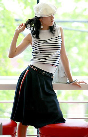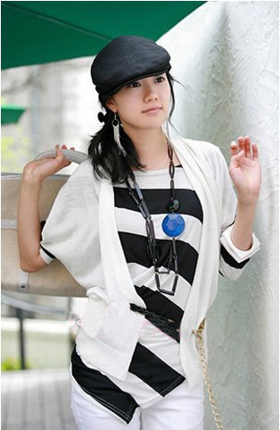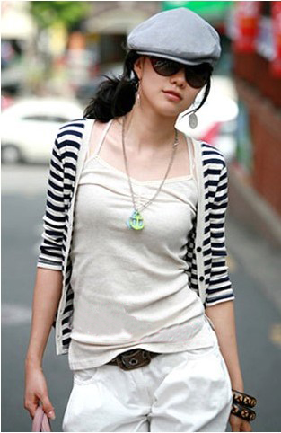 03 黑白條色經典裝扮給黑色貝雷帽以完美的色彩氛圍,充分展現女性的柔媚