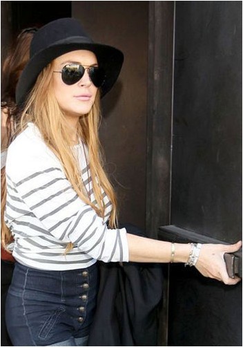 林賽·羅韓(Lindsay Lohan)黑色禮帽搭配黑白條紋T裇衫,下身的牛仔短褲擁有青春氣質!黑色的墨鏡增加神秘感,簡單的色彩勾勒出了動感時髦的女郎。
