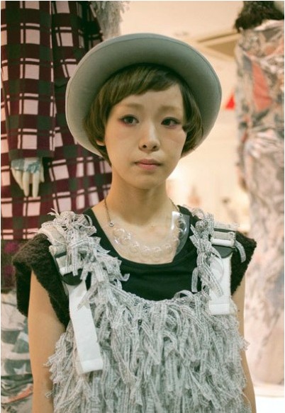 復古又帶點個性的寬檐圓頂帽搭配不規則修剪的短發,加上淺灰色挑染的發色,趣味十足。